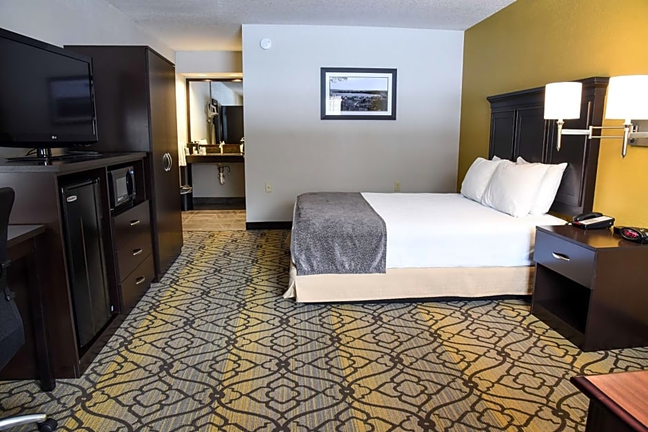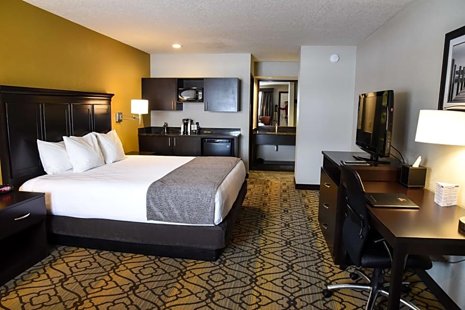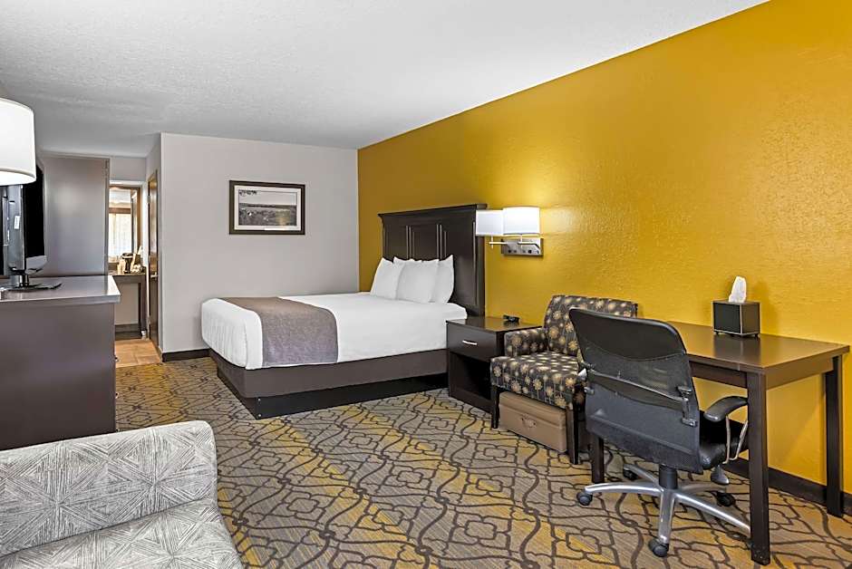 This king room has a microwave, sofa and fireplace. The fireplace works with gas.